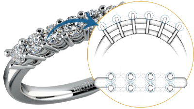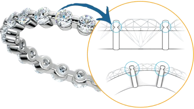 In this more secure variation of the traditional channel setting, diamonds or gemstones are secured in place between two vertical metal walls on either side of each diamond.