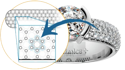 In this dramatically elegant setting type, diamonds or gemstones are set low and very close together using tiny beads. The surface of the ring will appear to be encrusted with stones for a brilliant effect.