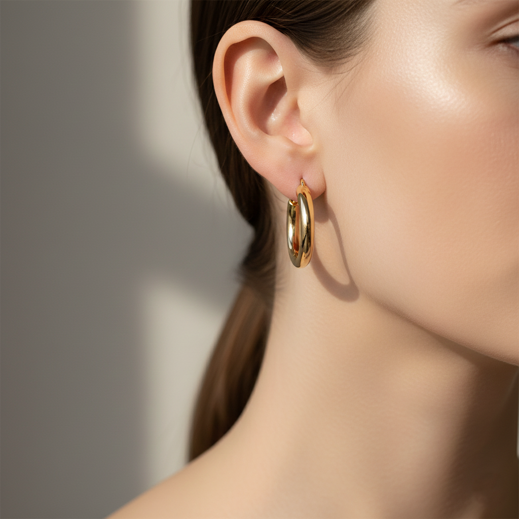 Platinum, gold, or silver hoops give a female touch, and valuable metals go with anything. For included shimmer, pick a couple with diamonds.