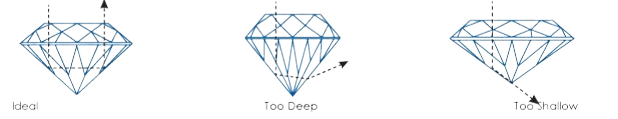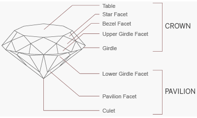 A diamond is made up of two key sections, the Crown and the Pavilion. Their structure and relationship to each other in the form of table and depth percentages have the biggest impact on the diamond’s sparkle.